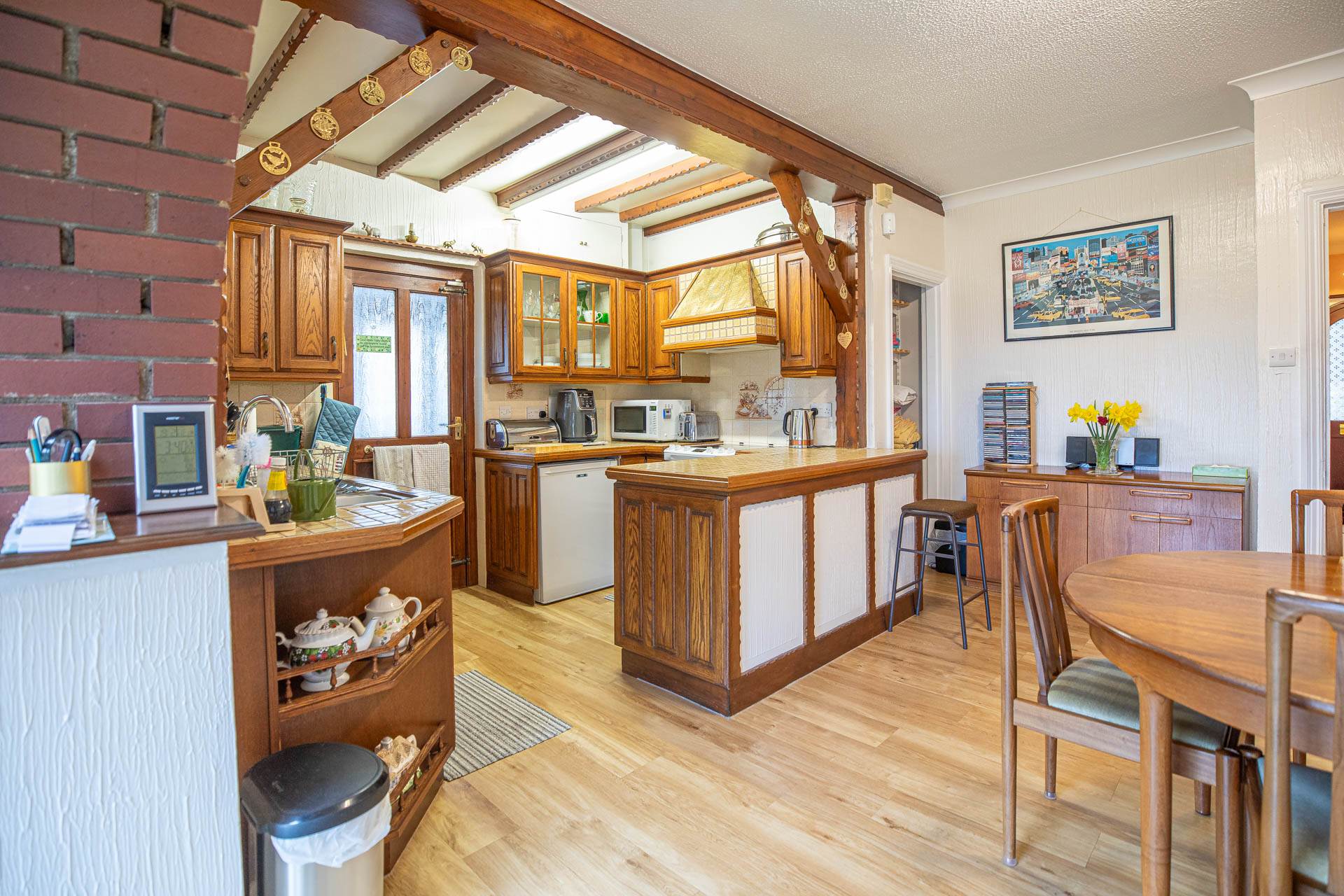Door to side, exposed timbers, coving, range of fitted wall and base units with Oak door and draw fronts complemented with a tiled work tops, display units, breakfast bar, stainless steel one and a quarter bowl sink unit with mixer tap, tiled splash backs, space for cooker with extractor hood over, plumbing for washing machine, space for fridge. Radiator.